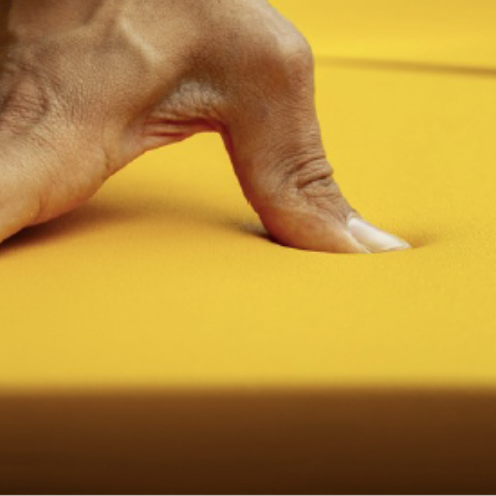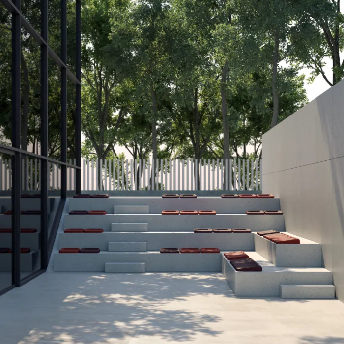 Le concept : un module unique en Flexyskin®, un polyuréthane souple, bio-sourcé et recyclable, pensé pour transformer un gradin brut en un espace confortable et design.