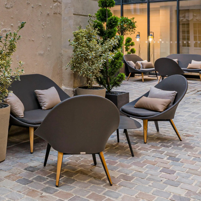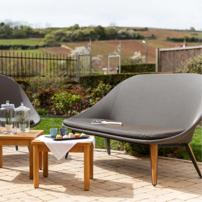 Avec son design rétro et sa structure en aluminium incrustée de teck, le Canapé Vanity 2 places crée des espaces lounge élégants sur vos terrasses, patios ou rooftops d’entreprise.
