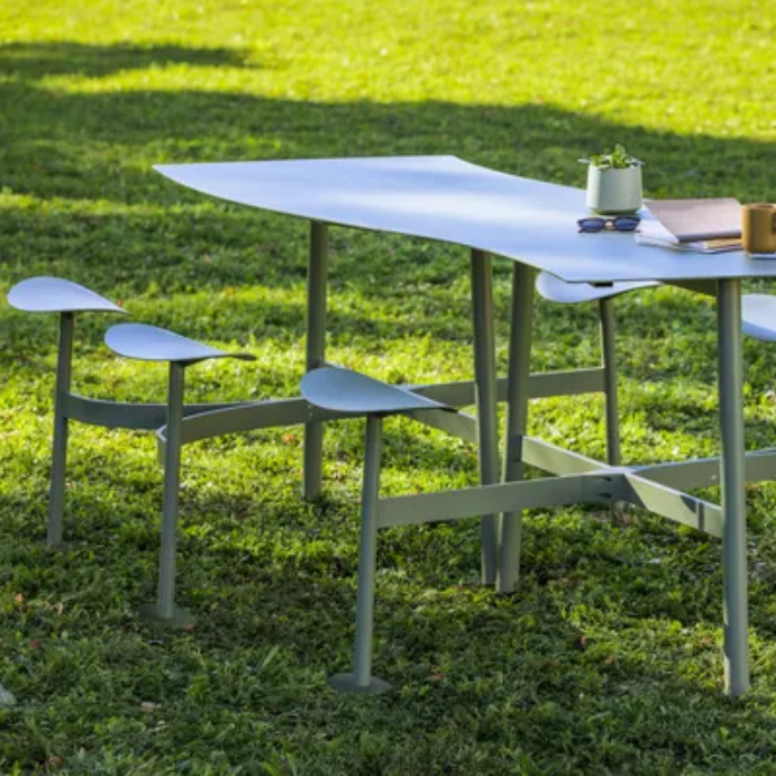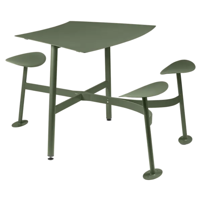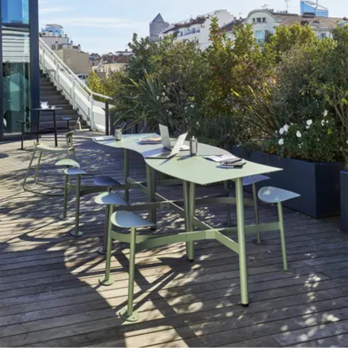 Conçue pour les espaces collaboratifs en plein air, la table haute Bolder 3 places intègre assises et plateau dans un design compact et ergonomique. Elle favorise les échanges rapides, informels ou conviviaux sur les terrasses, patios ou rooftops d’entreprise.