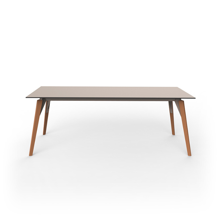 Matériaux premium : plateau en HPL, Solid Core ou Dekton ; piètement bois sur structure aluminium.
