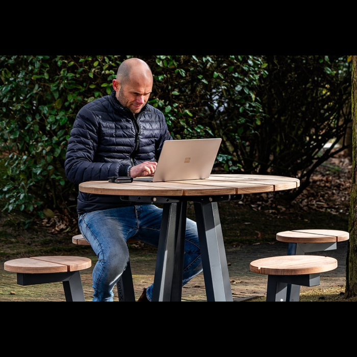 Compacte et chaleureuse, elle est idéale pour les terrasses d’entreprise, espaces de pause ou zones informelles de coworking, offrant confort et convivialité même dans des surfaces réduites.