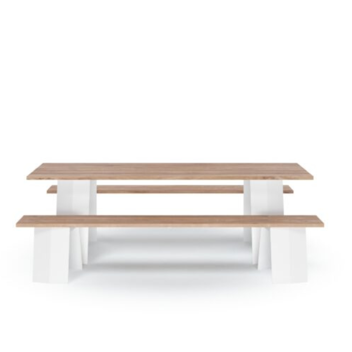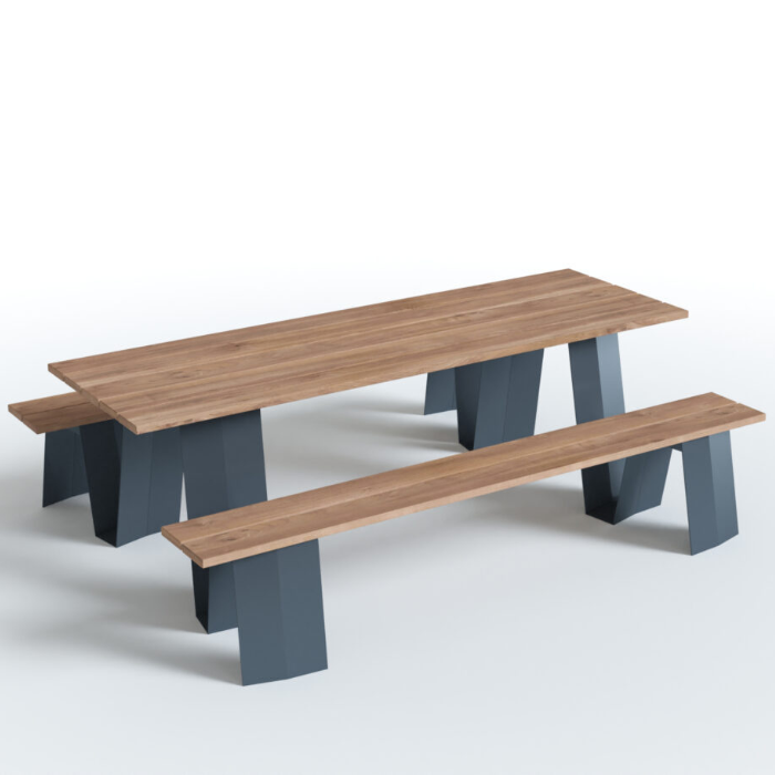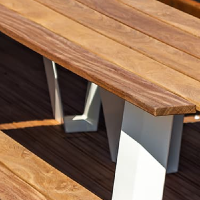 Elle combine un plateau en bois dur FSC, résistant et chaleureux, avec une structure en acier traité, proposée dans le coloris RAL de votre choix. Cette alliance garantit une excellente robustesse et une tenue parfaite face aux intempéries.